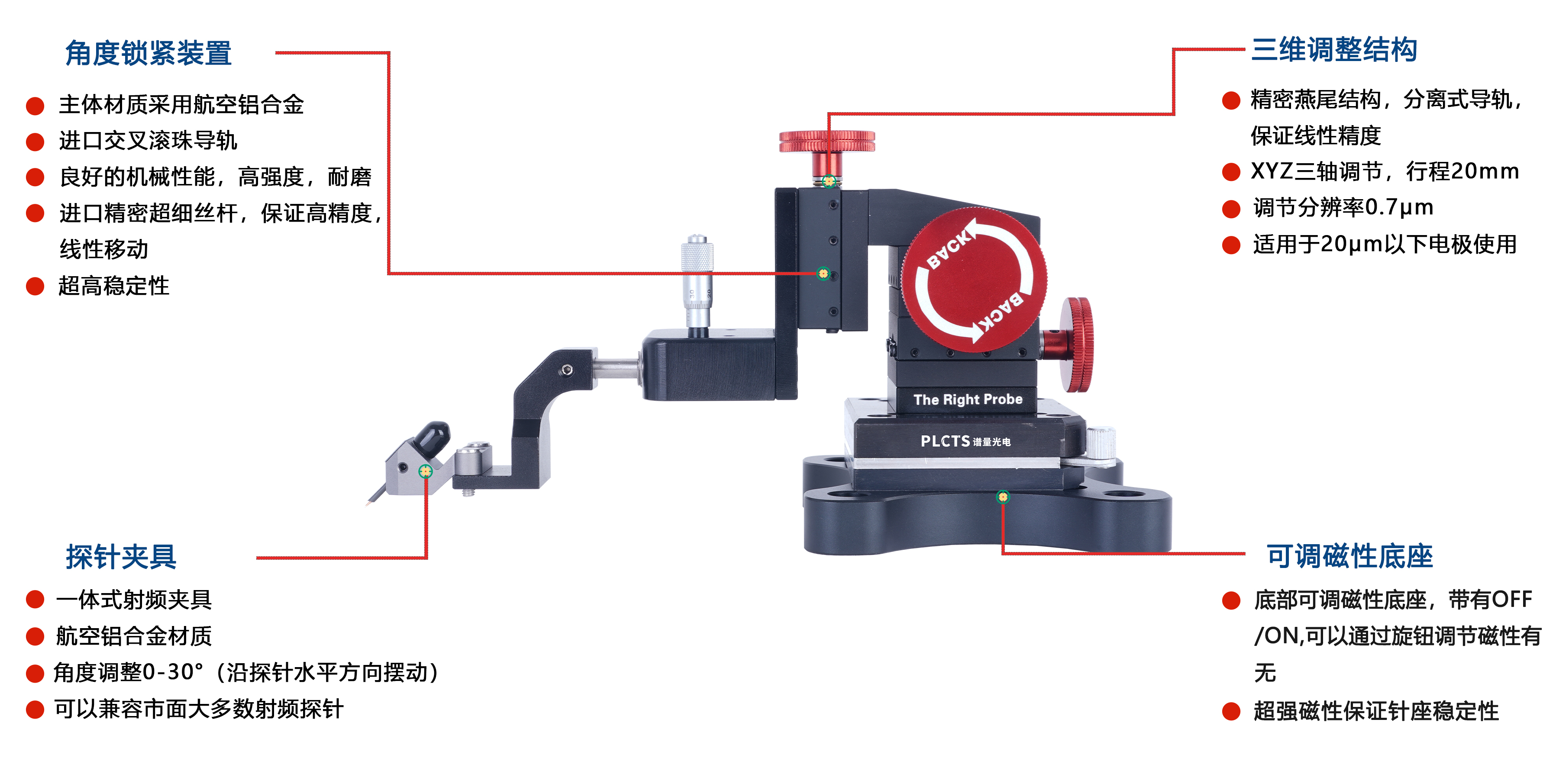 PLCTS 0.7μm调节精度射频探针座集成了进口细牙丝杆以及进口交叉滚珠导轨,保证了探针运行过程中的稳定性以及精度,底部配备日本进口超强磁性底座,可以通过开关调节磁性的有无,磁力超强,稳定性高,探针移动不偏移,集成射频专用夹具,沿X轴倾斜摆动0—30°角度可调,方便调整射频针尖状态,完成射频测试!