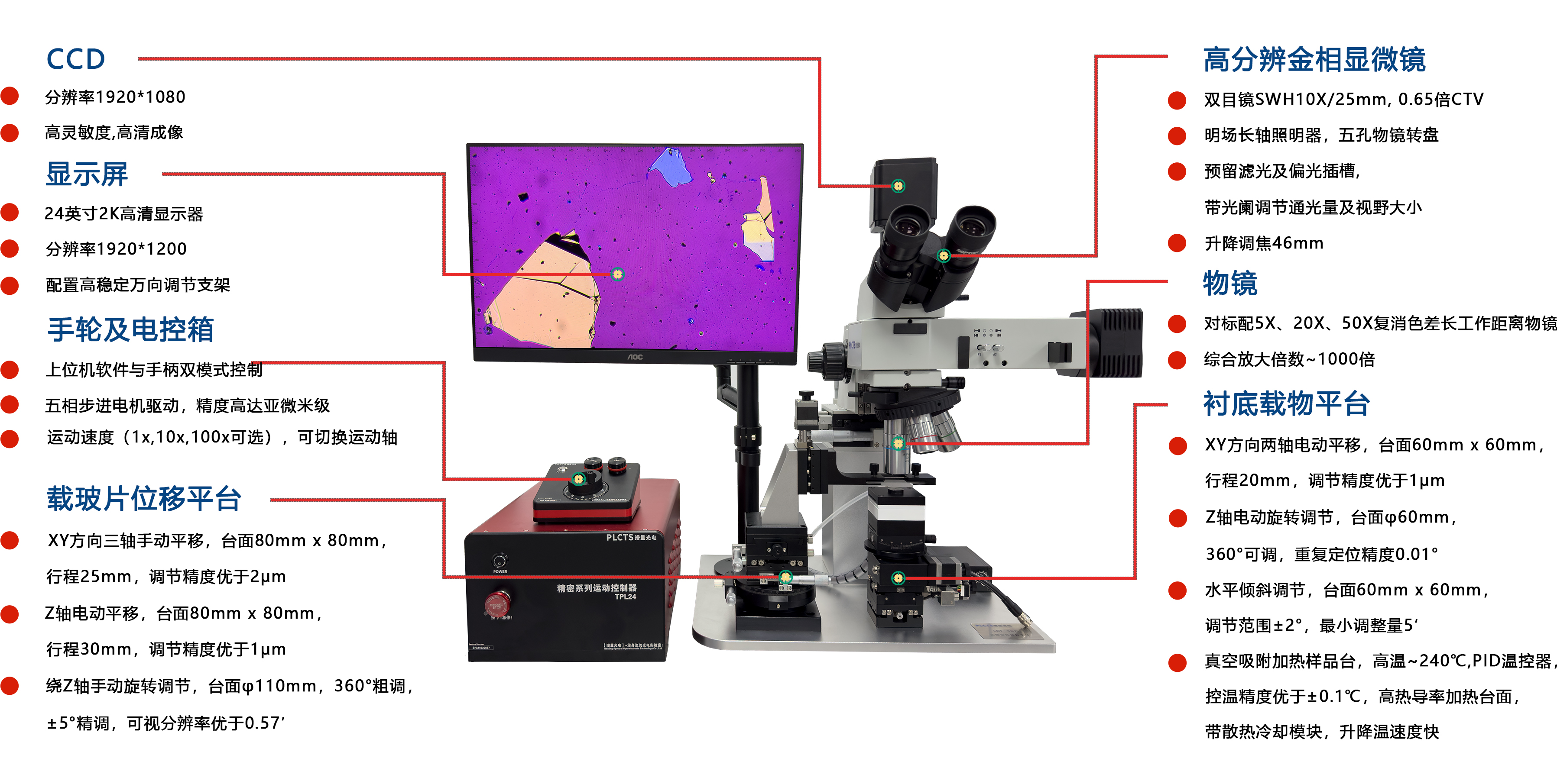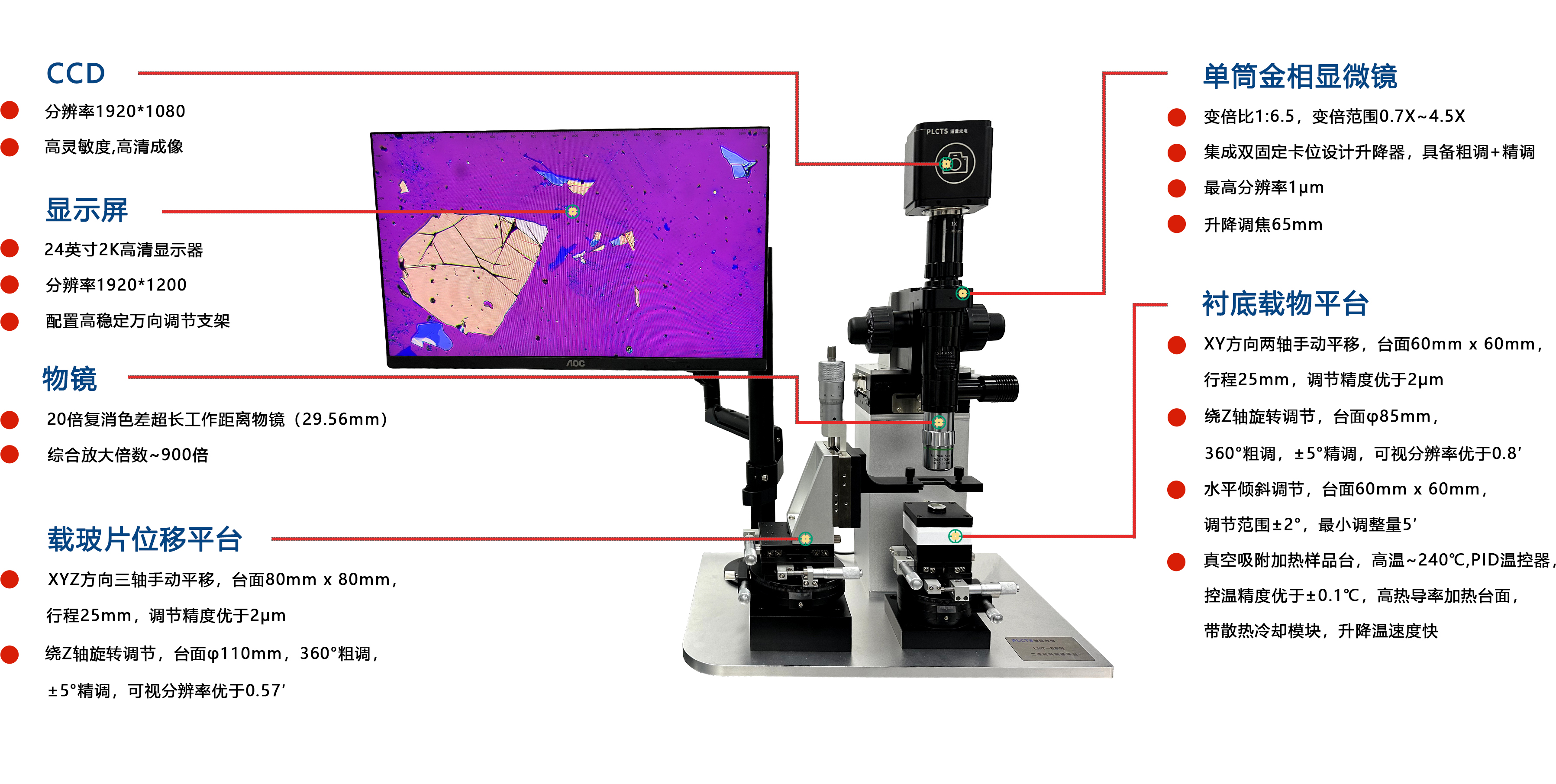 PLCTS 精密型二维材料转移平台搭配单筒显微镜,变倍比1:6.5,变倍范围0.7X-4.5X,综合放大倍数~900倍。使用PID温度控制器,控温精度优于±0.1℃提高材料转移的稳定性。还配有风冷散热模块,大大的提高整体实验转移的效率。主要实现低维材料(如石墨烯、过渡金属硫化物、黑磷等)的精确转移和定位的作用。