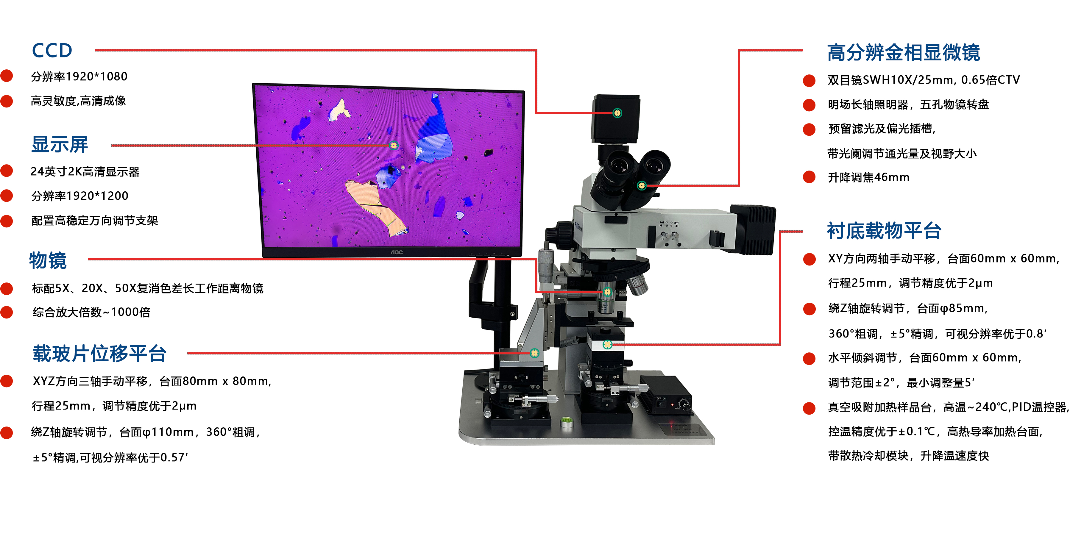 PLCTS 高分辨二维材料转移平台是在LMT-B系列基础上将单筒显微镜升级为金相显微镜,标配5X、20X、50X物镜五孔物镜转盘,综合放大倍率:~1000倍。不仅提高了画面成像的质量,还更利于切换高低倍寻找样品和转移。显微镜还预留滤光及偏光插槽,带光阑调节通光量及视野大小,用于对特殊样品的观察,以此提高低维材料转移的稳定性。