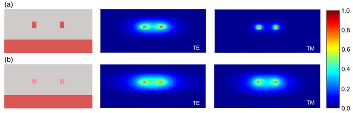 图2:双头波导以及TE和TM模式场分布的横截面图像。