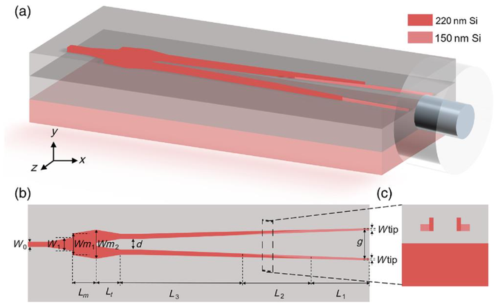 端面耦合器是实现芯片与光纤连接的核心器件,其性能直接取决于波导模场与光纤模场的匹配程度。本文提出的双层双尖端端面耦合器(图1)通过协同优化波导结构与双尖端设计,显著降低了模式场失配与偏振依赖性。本文提出了一种基于双层与双尖端边缘耦合器的创新方案,旨在实现O波段光纤与芯片间的高效耦合,同时最大限度降低偏振态损耗(PDL)。通过采用多重刻蚀工艺,我们有效降低了波导的纵向模式约束,实现了横向电场模(TE)和横向磁场模(TM)的高耦合效率。实验验证表明,该边缘耦合器在整个O波段范围内性能优异,当与具有模式场直径(MFD)4μm的透镜光纤耦合时,两种偏振方向的耦合损耗均低于2 dB/端面。