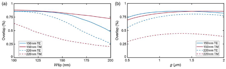 为定量分析两种波导结构的差异并实现更高耦合效率,我们针对尖端波导宽度和间距进行了优化设计,并计算了其与4μm MFD透镜光纤模式的重叠度。首先,我们对尖端波导宽度进行了优化模拟(如图3(a)所示)。图中实线和虚线分别代表高度为150纳米和220纳米的波导结构,红色和蓝色线条分别对应TE和TM模式。从仿真结果可见,红色实线的整体重叠度比红色虚线高出20%以上,充分证明了我们设计方法的有效性。当波导结构高度为220纳米时,TE和TM模式的重叠度存在显著差距,难以同时实现高效耦合与光子带隙(PDL)的双重目标。然而,当波导结构高度为150纳米时,在100至150纳米的尖端宽度范围内,两种模式的重叠度均接近80%以上。