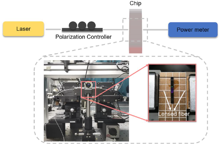 为表征所制备的边缘耦合器性能,我们采用波长范围在1260至1360纳米之间的可调谐激光器作为输入光源。通过光功率计测量芯片输出端的耦合功率,并使用偏振控制器将输入光的偏振态控制在TE和TM模式之间。耦合装置 该装置由两个精密六轴对准台、2个观察系统(垂直+水平)和一个芯片支架组成,如图7插图所示。我们在光纤支架两侧各固定一根4-MM MFD透镜光纤,并通过调整六轴对准台使功率计测得的光功率最大化。通过调节输入光波长和偏振控制器,我们对器件在整个0波段范围内的TE和TM耦合损耗进行了表征。图8展示了器件的测试与仿真性能对比,其中实线和虚线分别代表实验与仿真结果,红色和蓝色曲线分别对应TE和TM模式数据。观察发现实验结果虽略逊于仿真结果,但两者呈现一致趋势,充分展现了器件在偏振相关损耗方面的卓越性能。在1310 nm波长下,TE和TM模式耦合损耗分别测量为1.18 dB/端面和1.46 dB/端面。光谱中出现的噪声源于测试过程中耦合装置的振荡以及光纤与芯片间的反射。在整个0波段范围内,TE和TM模式耦合损耗分别<1.52 dB/端面和2 dB/端面。