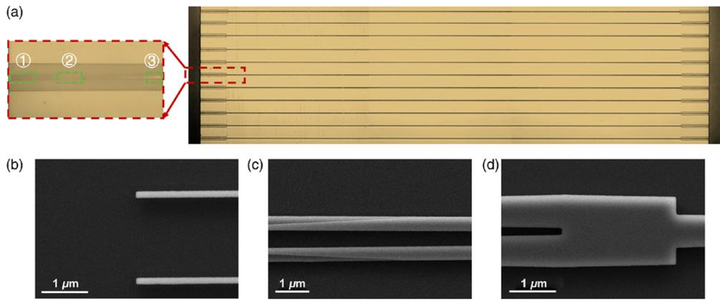 团队设计的器件是在SOI晶圆上制造的,其顶部硅层厚度为220纳米,埋入式二氧化硅层厚度为2μm。该器件设计分为两层结构,通过多道蚀刻工艺完成。首先使用电子束光刻(EBL)技术,在晶圆表面旋涂ZEP520电子束抗蚀剂。随后利用EBL将图案转印至抗蚀剂层。接着通过电子束蒸发沉积10/50纳米厚的铬/金金属层,并进行剥离处理去除多余金属,最终形成图案化结构。在第二步EBL工艺中,将第一层结构转印至电子束抗蚀剂层。为将结构转印至硅层,采用电感耦合等离子体(ICP)蚀刻工艺对顶部硅层进行220纳米深度蚀刻。在另一轮EBL和ICP工艺中,将第二层结构转印至硅层并蚀刻70纳米。最后通过等离子体增强化学气相沉积法在顶部沉积2μm厚的二氧化硅包覆层。图6(a)展示了器件的光学显微镜图像,插图为边缘耦合器的放大视图。图6(b)-6(d)为图6(a]插图中标记区域的扫描电子显微镜(SEM)图像。