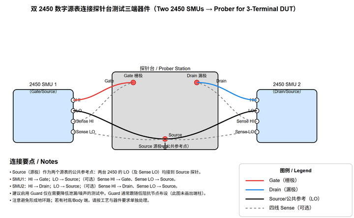 (4)利用两台 Keithley 2450 源表配合探针台,可以构建一个功能强大、精度高的三端器件测试平台。希望这些信息能帮助您顺利完成测试。