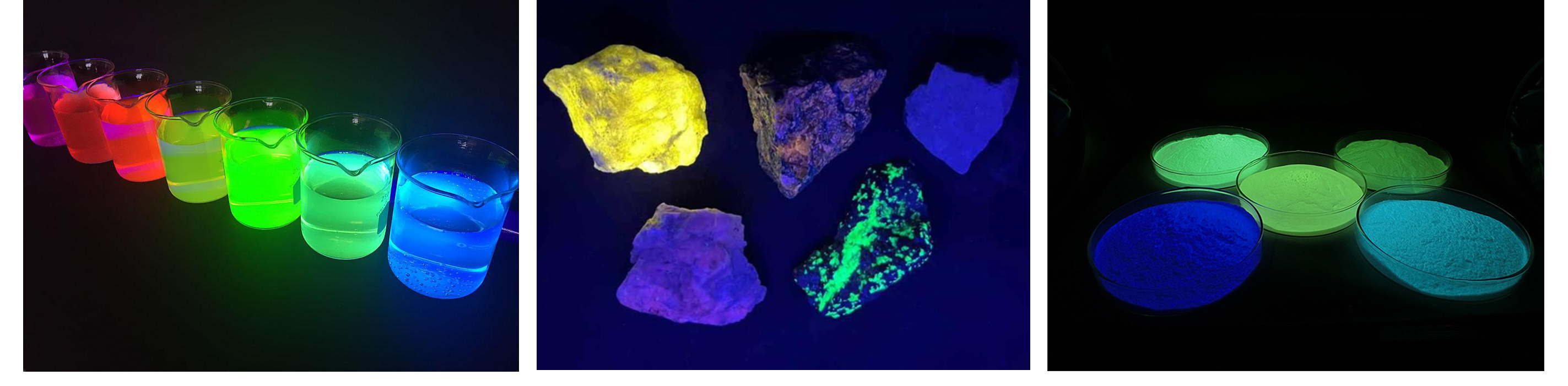 吸收高能量的蓝光 → 发出绿色、黄色或红色的光(荧光笔、某些矿物)。