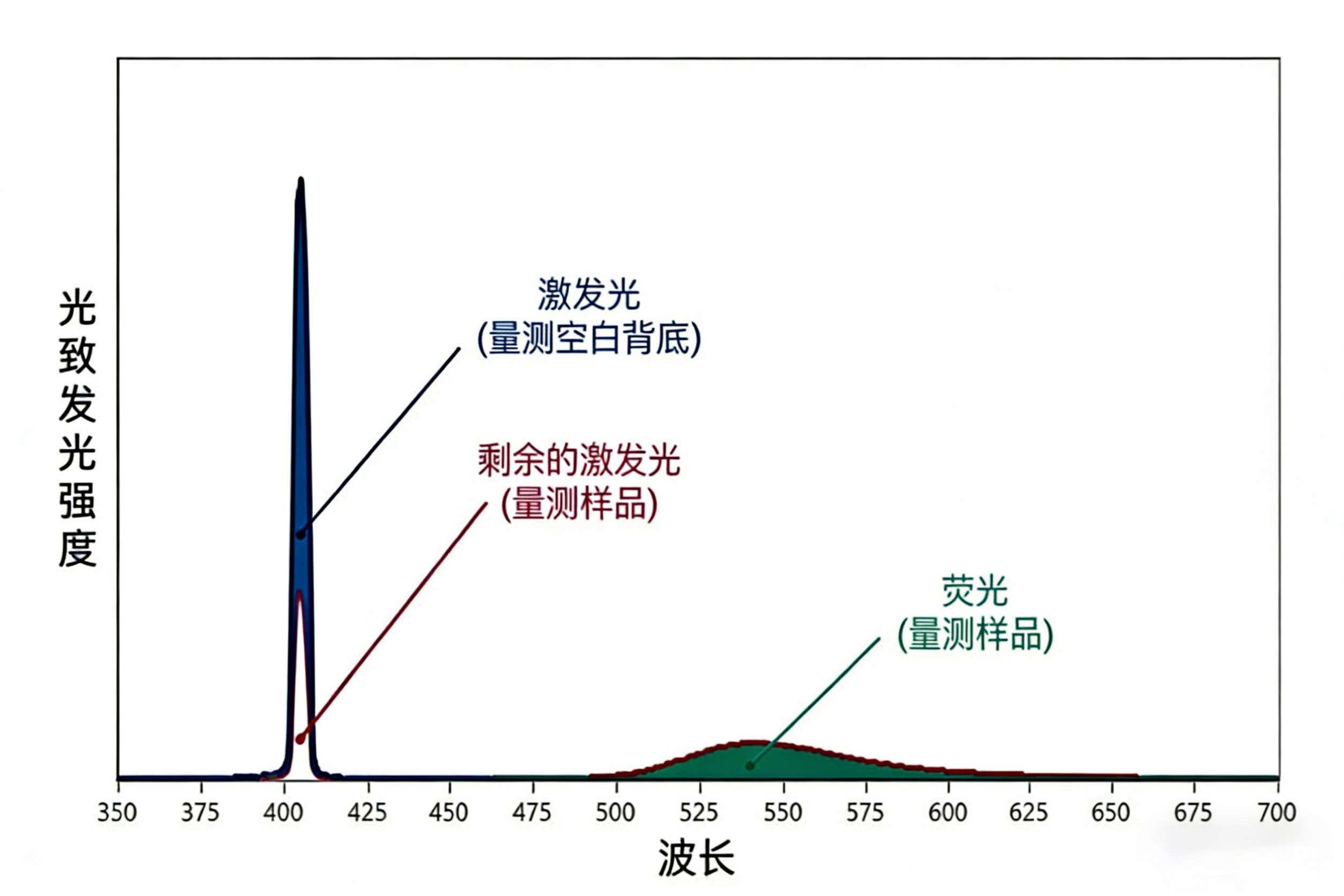 在进行光致发光量子产率 (Photoluminescence Quantum Yield, PLQY) 的量测时,会先量测一个空白对照组,量测出来的光谱 (黑色光谱曲线) 只有一个激发光的峰。之后再放入要测试光致发光量子产率 (Photoluminescence Quantum Yield, PLQY) 的样品,在相同的光强下让激发光打在样品上,量测出来的光谱 (红色光谱曲线) 除了有原来的激发光的峰之外,同时也会有一个荧光峰出现。比较两条光谱曲线,可以发现样品激发光的峰值强度会低于空白对照组的峰值强度,表示样品吸收了部分的激发光。而在样品的光谱曲线多出来的荧光峰,就是光致发光 (Photoluminescence, PL) 所产生荧光。
