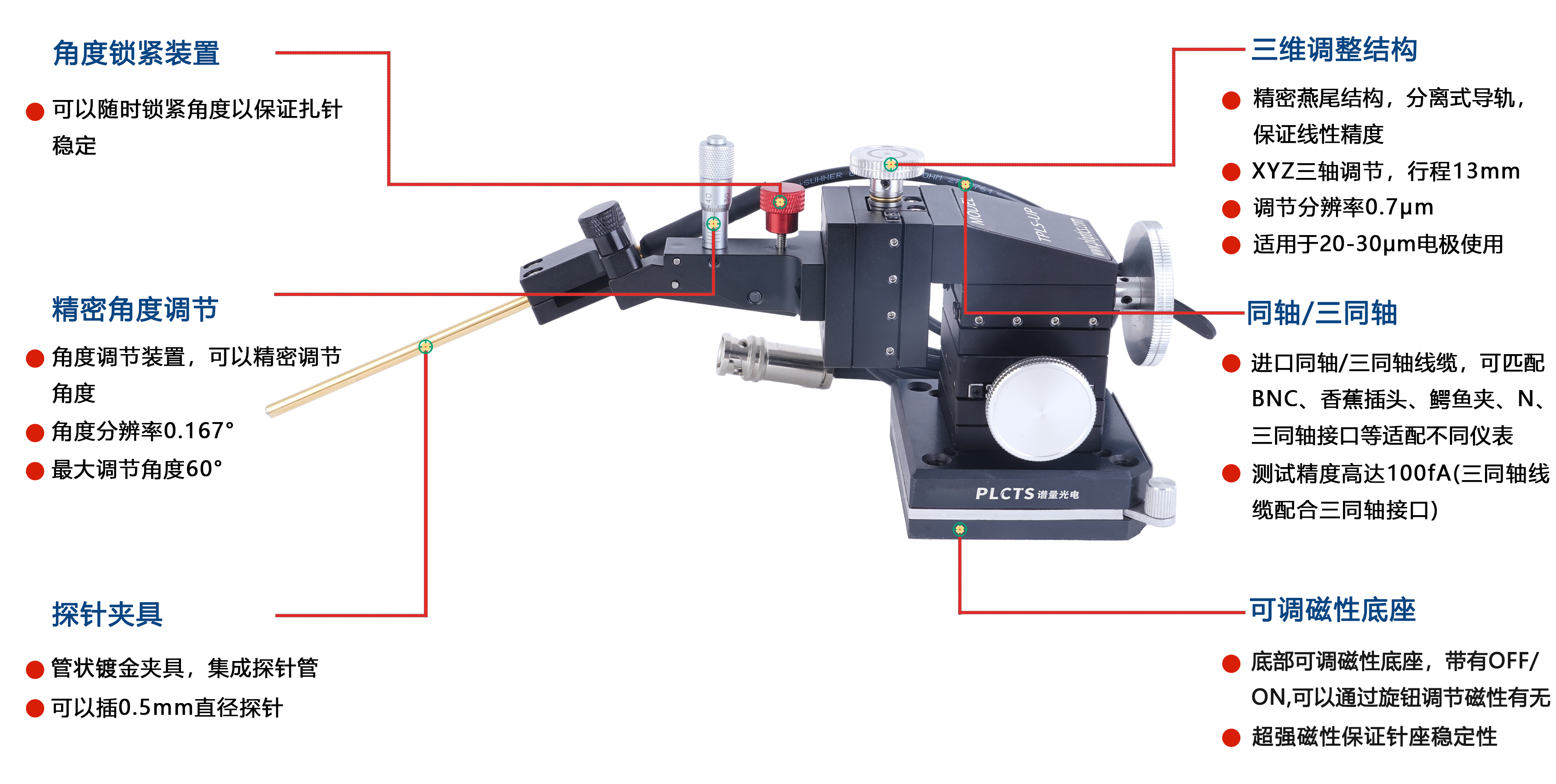 | 探针位移行程 XYZ13mm+180°旋转+60°精密定向倾斜调节 |