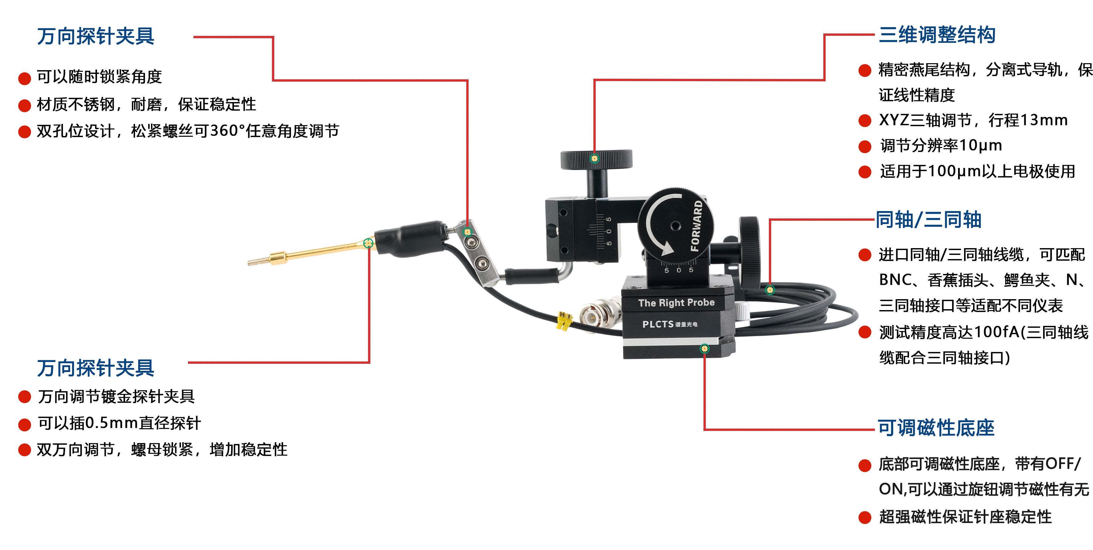 PLCTS 万向型10μm探针座适整体采用铝合金材质,表面喷砂氧化。位移采用燕尾分离式导轨结构,保证线性位移;支持360°旋转及360°倾斜调节,适用于100μm以上特殊样品电极测试使用。