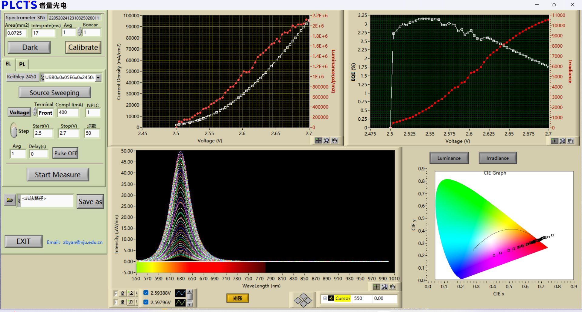 PLCTS 电致发光测试系统主要由积分球、光纤光谱仪、多模光纤、Keithley数字源表、样品夹具、积分球支架等组成。光纤光谱仪采用滨松制冷型面阵CCD传感器,不仅具有高灵敏度、低噪声、高信噪比低温漂等特点,还能够检测到更微弱的光信号。工作波长为200nm-1100nm,积分球采用进口的高漫反射材料PTFE高温烧制而成,反射率高达99%,光学接口选用标准的SMA905,具有良好的朗伯特性。样品夹具可根据客户要求定制。适用于量子点发光二极管、有机发光二极管、钙钛矿发光二极管等发光器件测试分析。