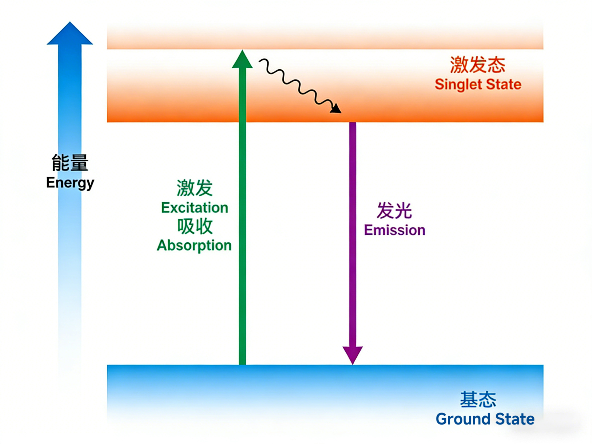 (如图1)越靠上方能阶越高,也就是能量越大,基态 (ground state) 指的是所有电子在低能阶的状态,其他有额外能量的状态则泛称 “电子的激发态 (singlet state / excited state)"。当荧光物质受到激发光的照射,原本位于基态的电子因为吸收了光的能量,因而被激发到激发态。处于激发态的电子可经多种途径回到基态。图中若电子以放光的方式释放能量回到基态,由此方式所放出的光,可广义称为 “荧光"。而此过程便称为光致发光 (Photoluminescence, PL)。